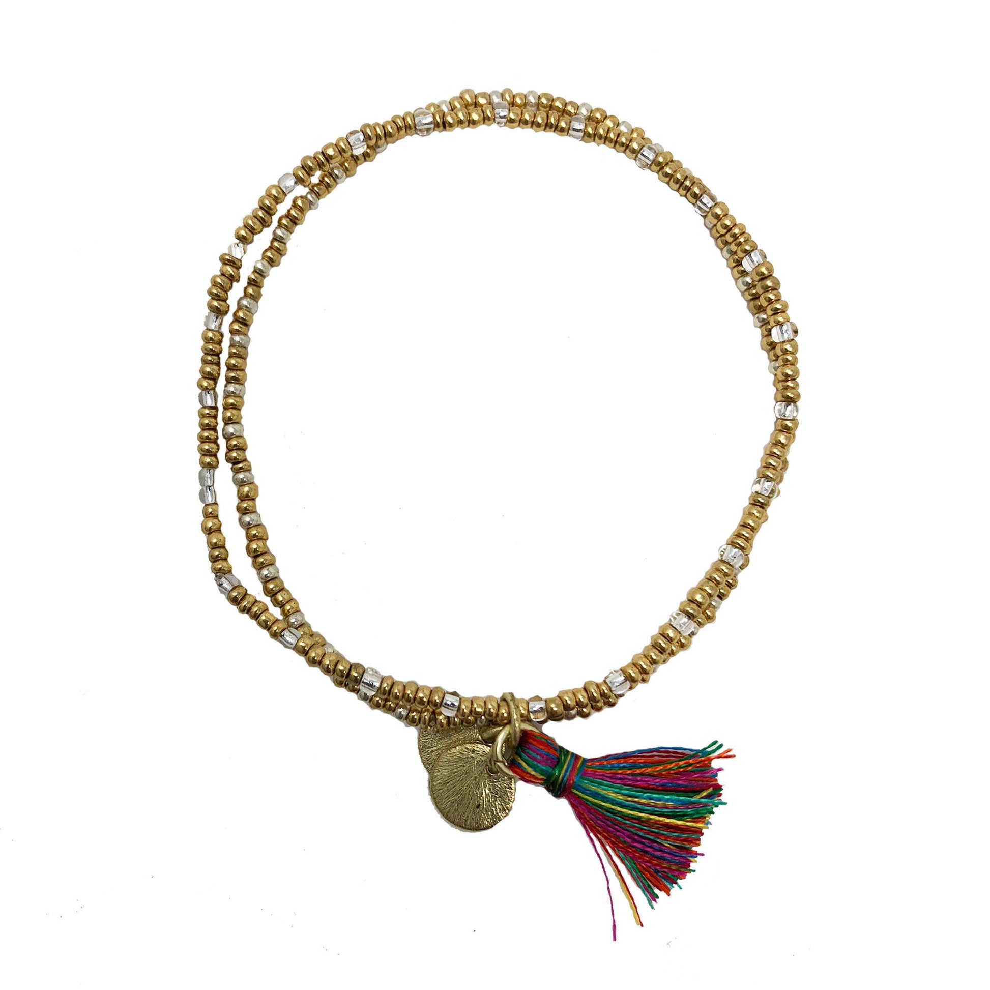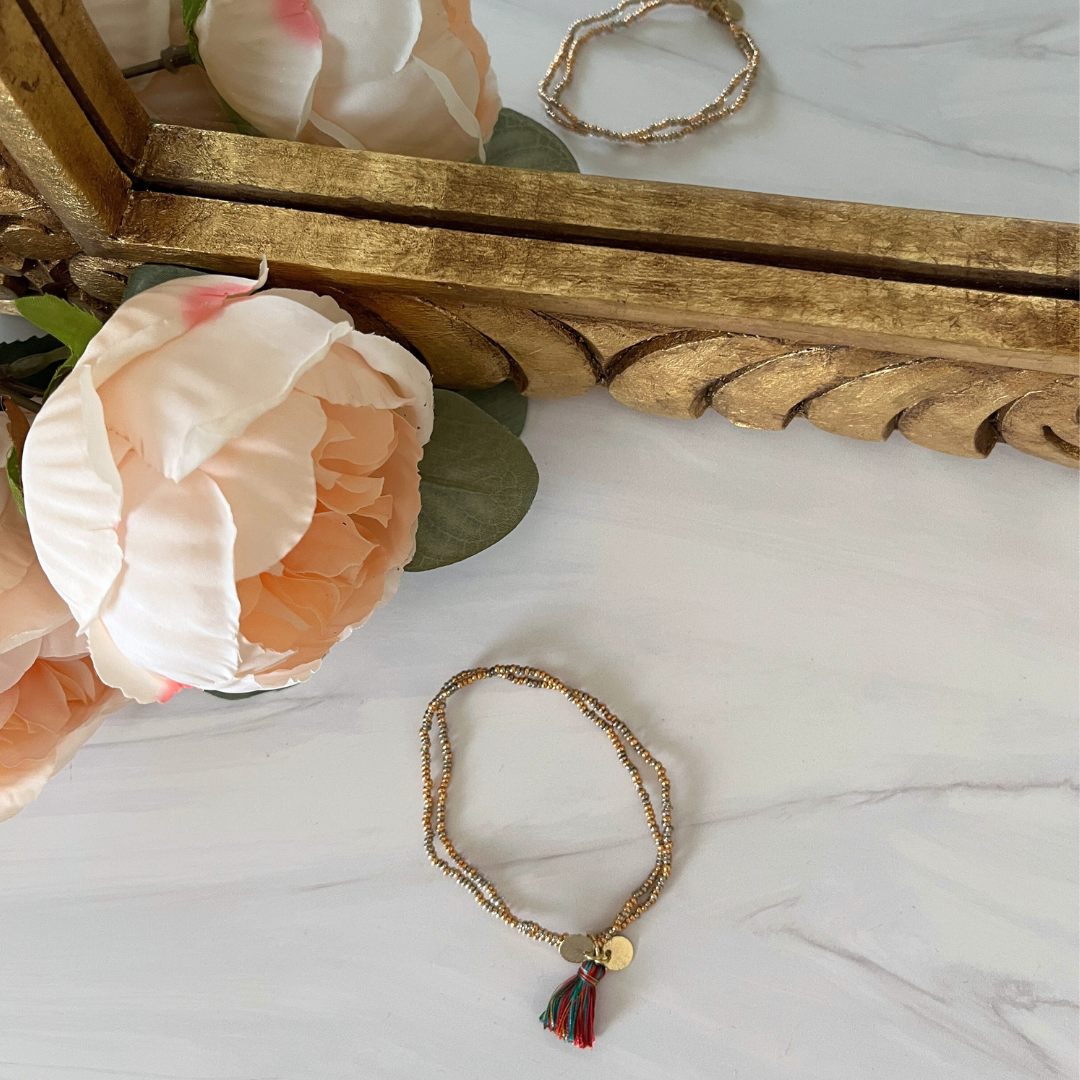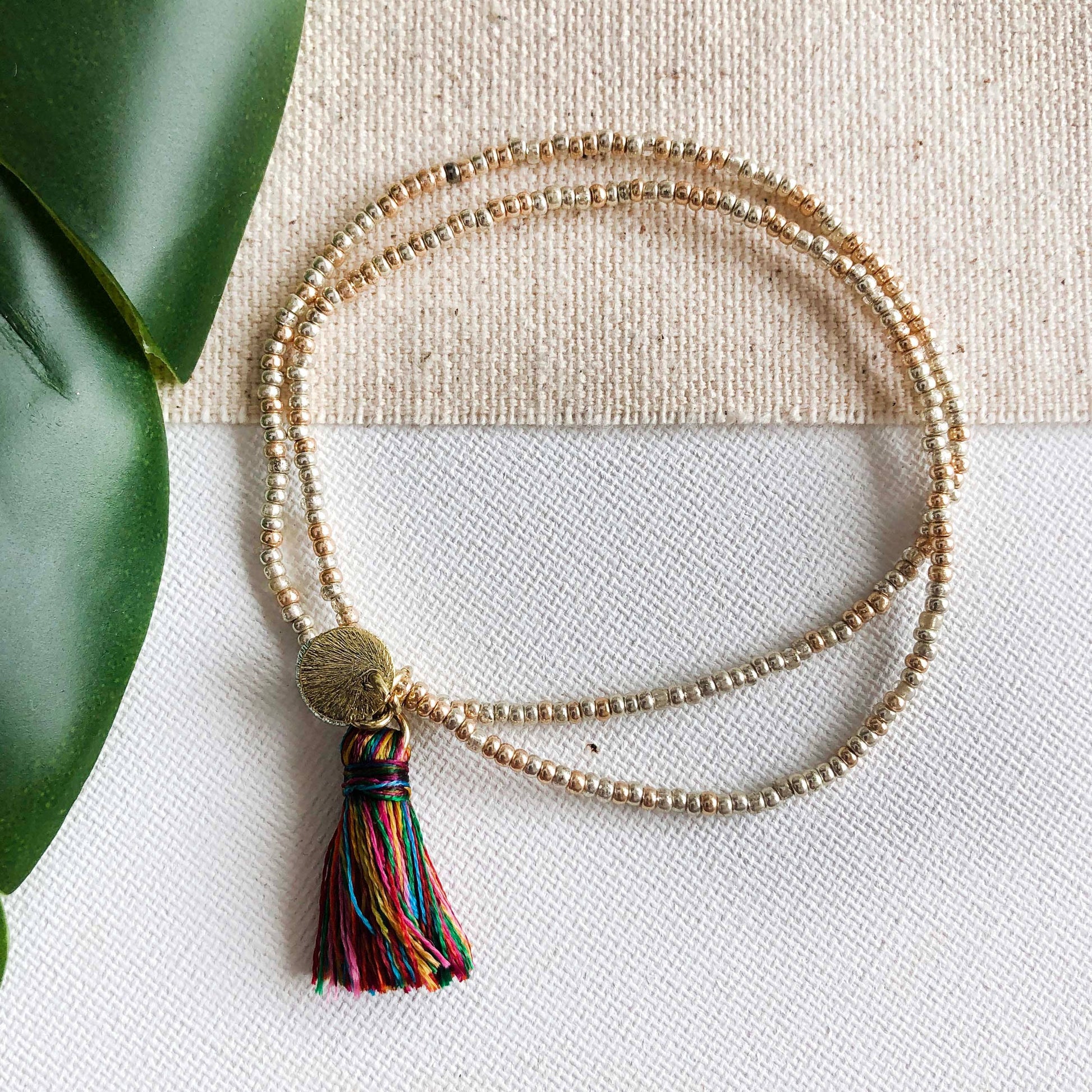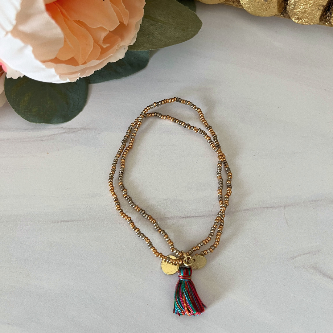 Alternating gold and silver, metallic beads are double wrapped to create this perfect layering bracelet.