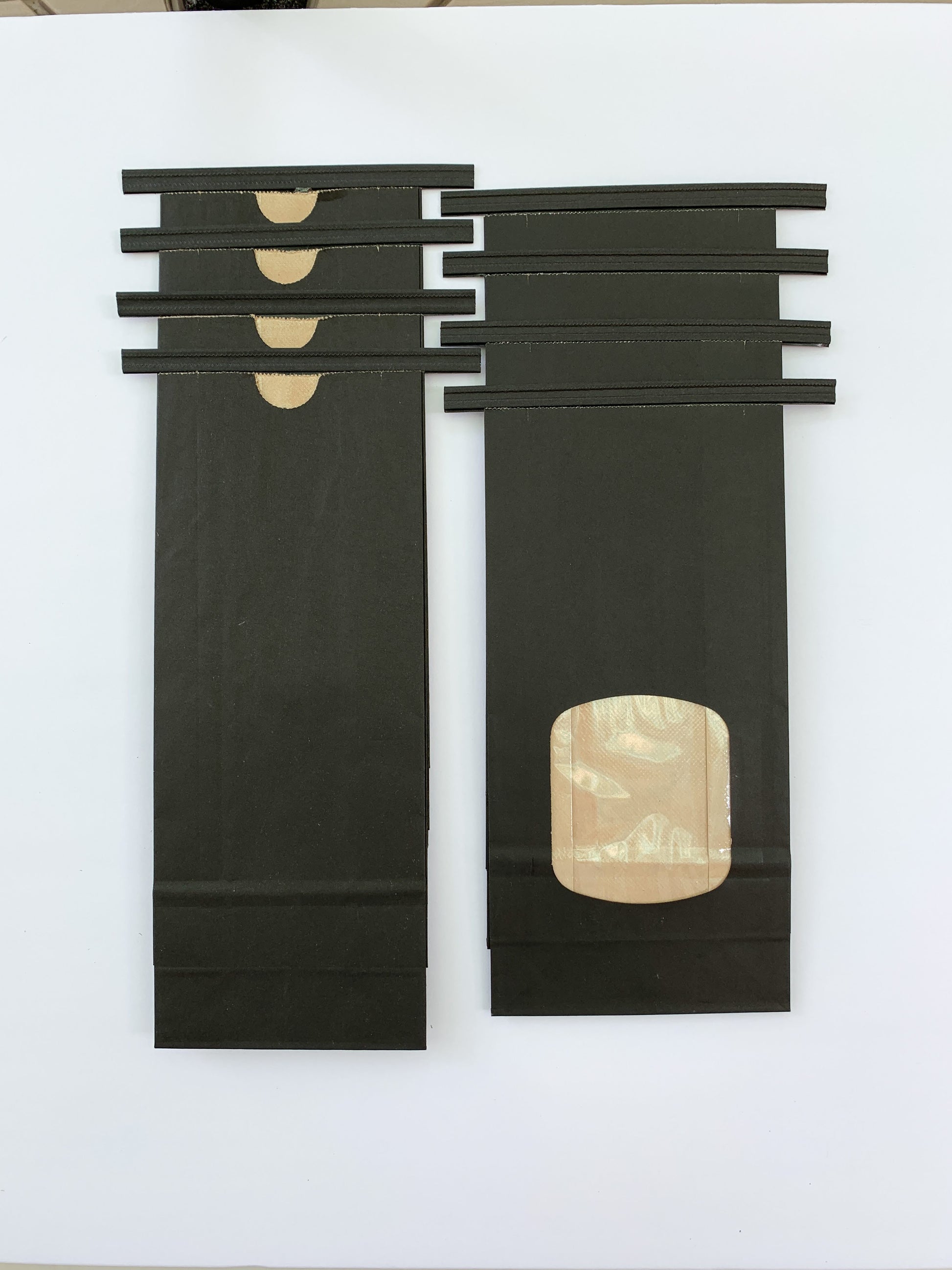 Black "chalkboard style" bags are kraft inside and have clear poly laminated inner liners and tin tie tops (metal tabs enclosed in paper with which to close the bags).