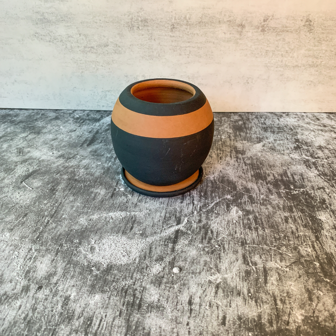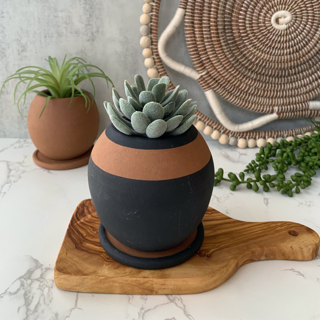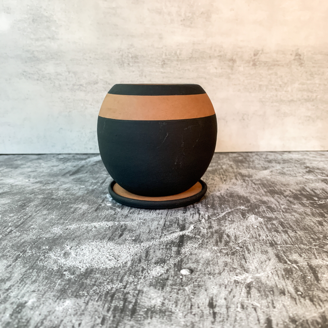 "Be Round" Small ceramic planter w/drainage plate - Black/Terracotta