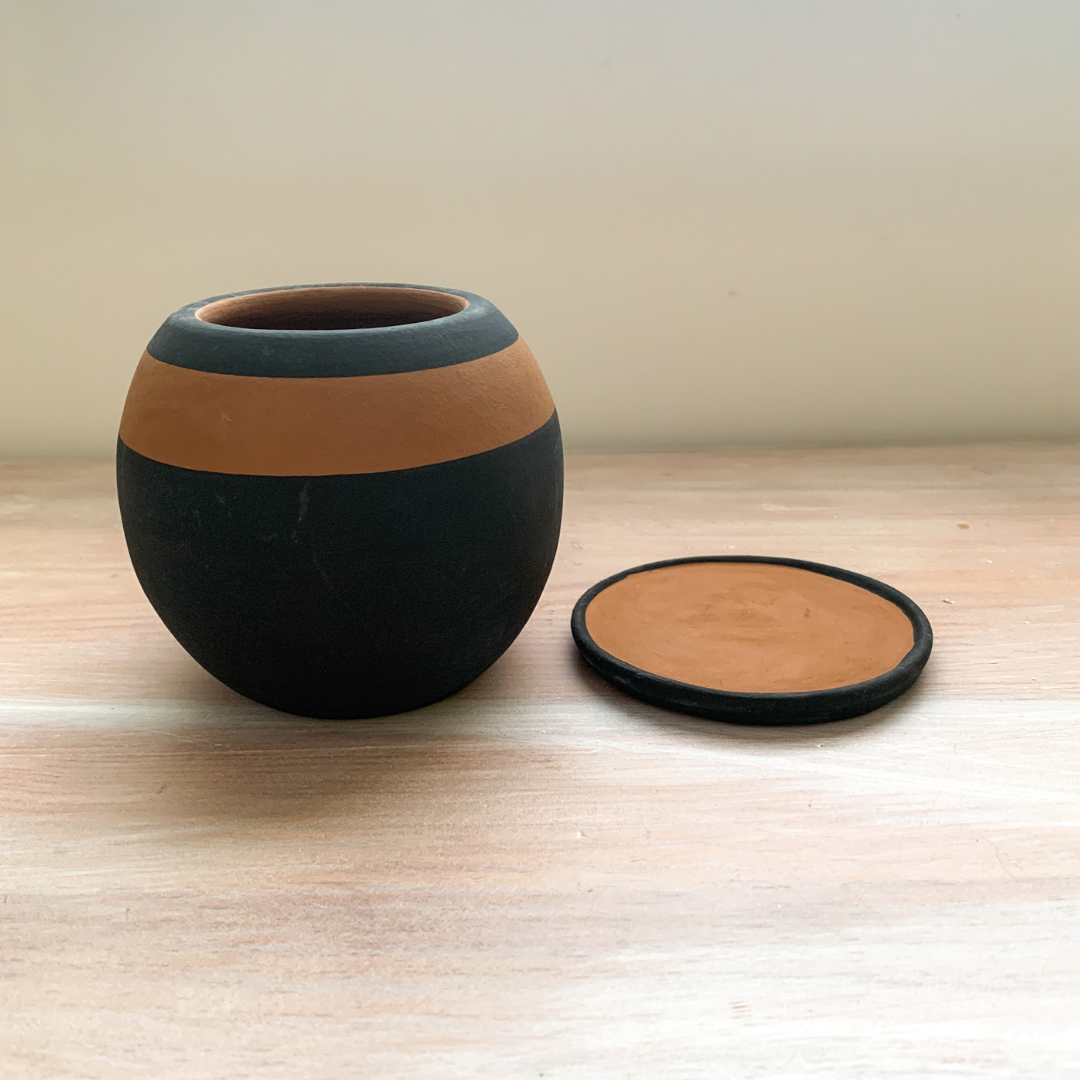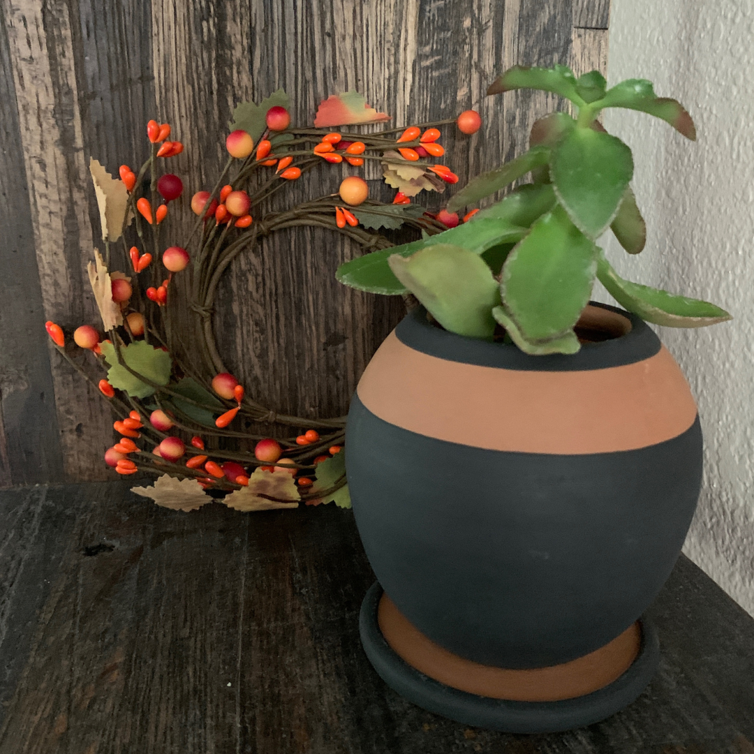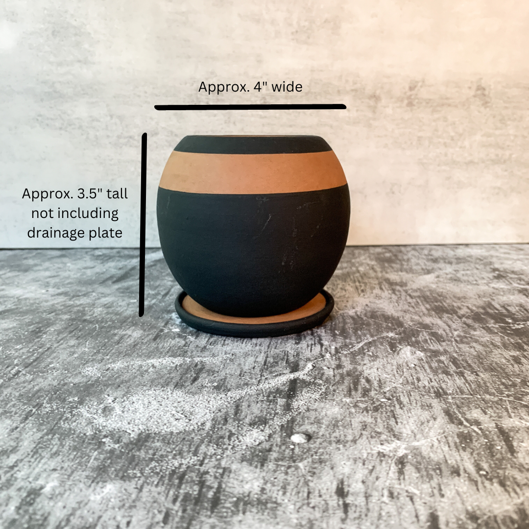 "Be Round" Small ceramic planter w/drainage plate - Black/Terracotta