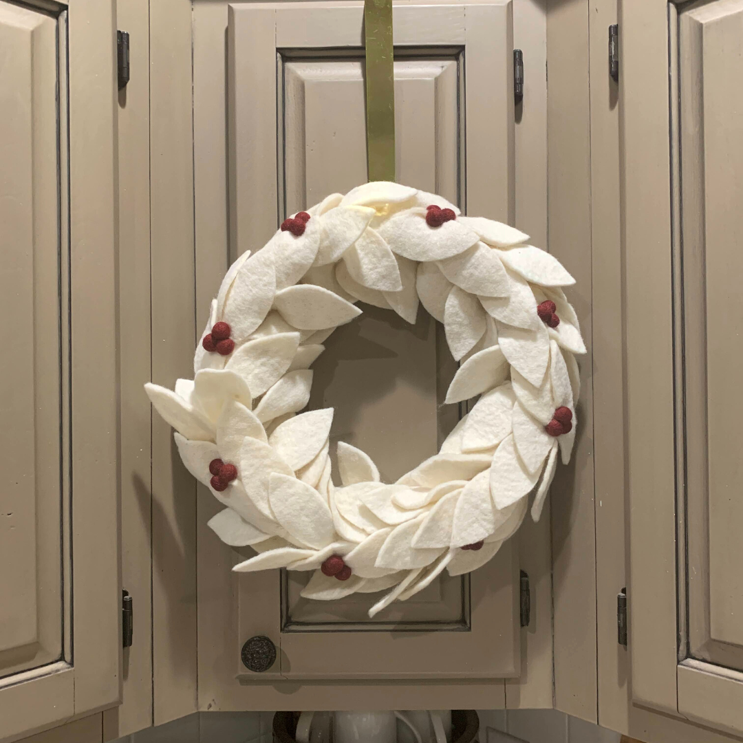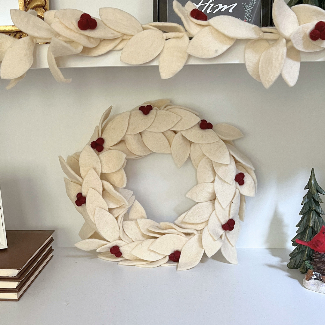 These felted wreaths are robust with thick creamy white leaves and bright red berries.