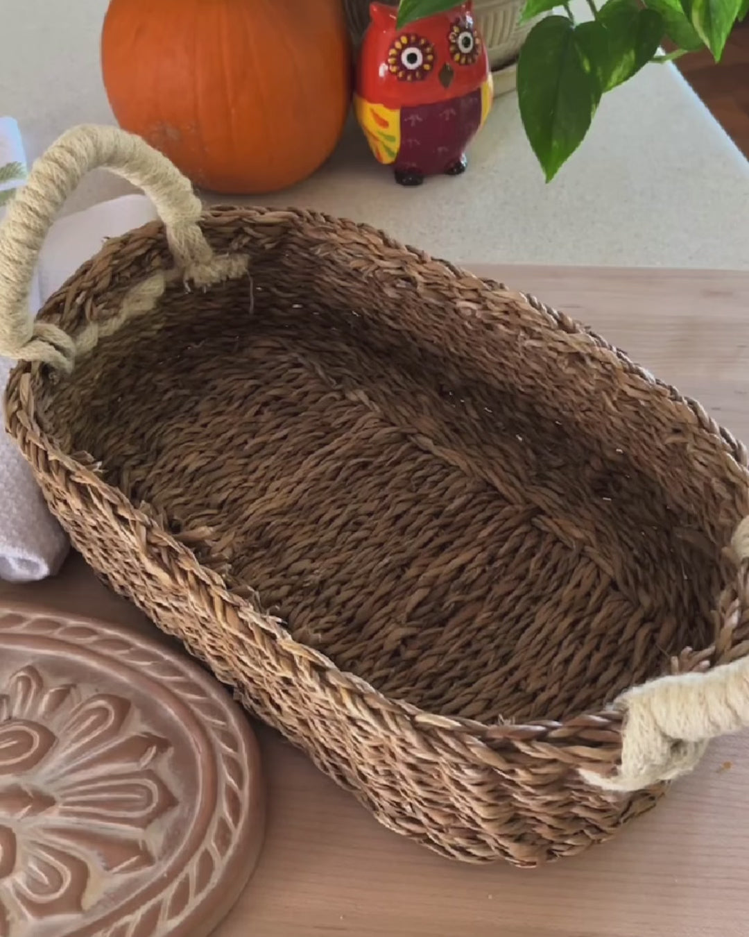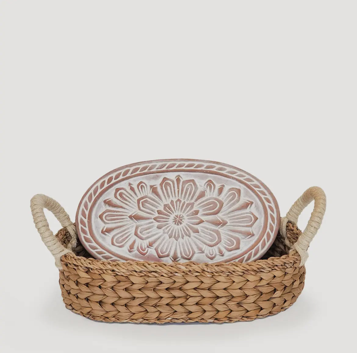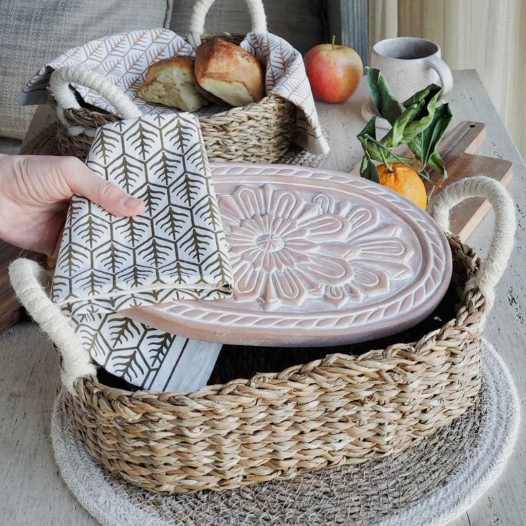 Stone is crafted 100% Terra Cotta / Basket 100% Seagrass and Jute wool. (Tea towel is not included)