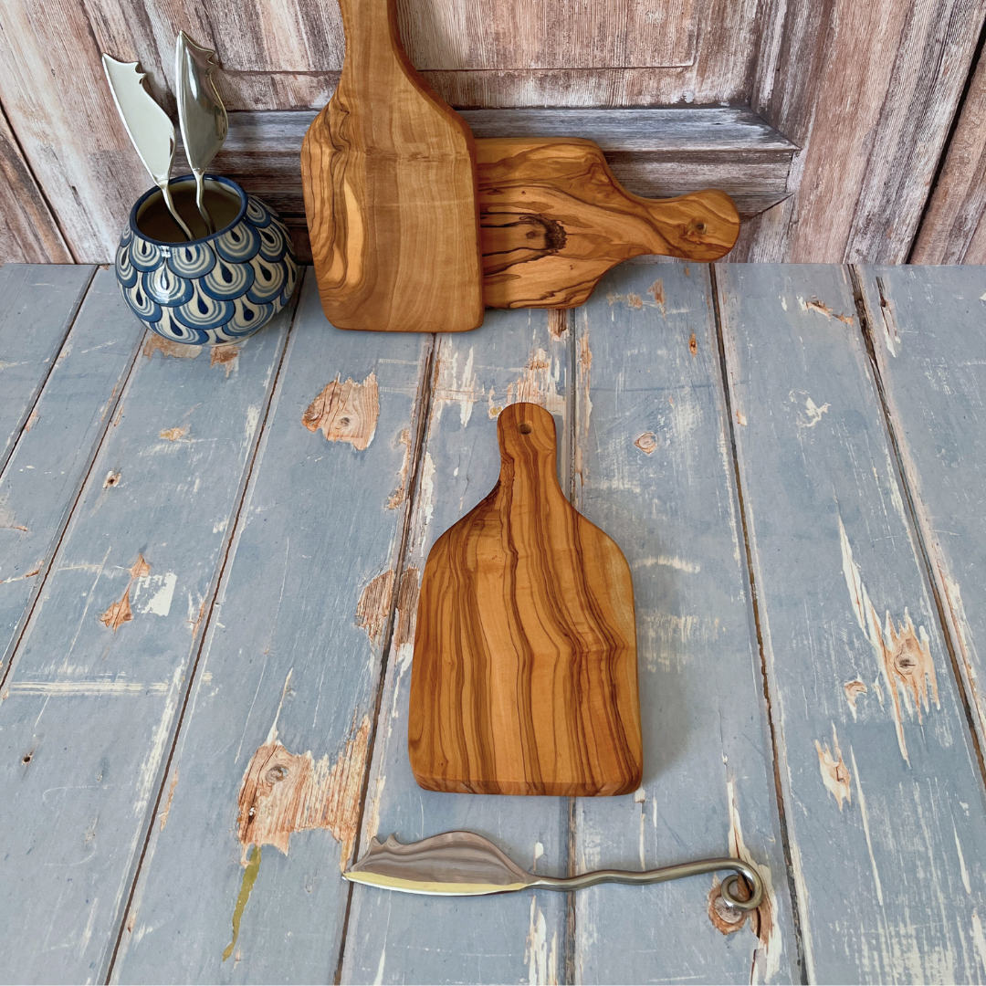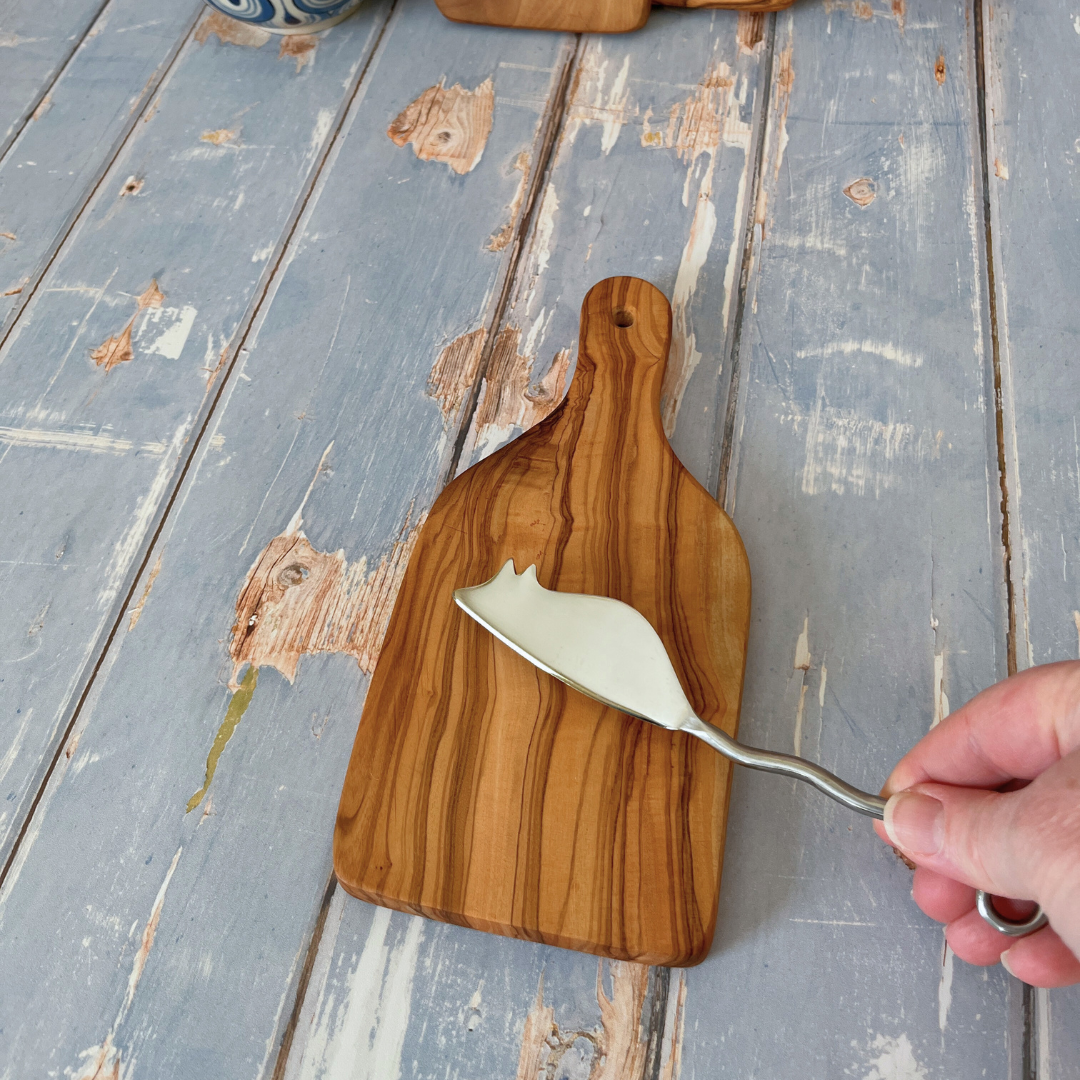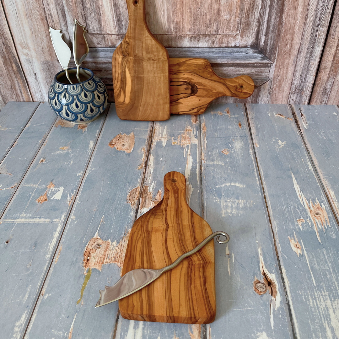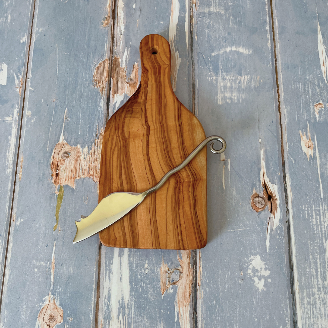 Sold as a set - Mini Olive Wood Paddle Board and Stainless Steel Cheese Knife