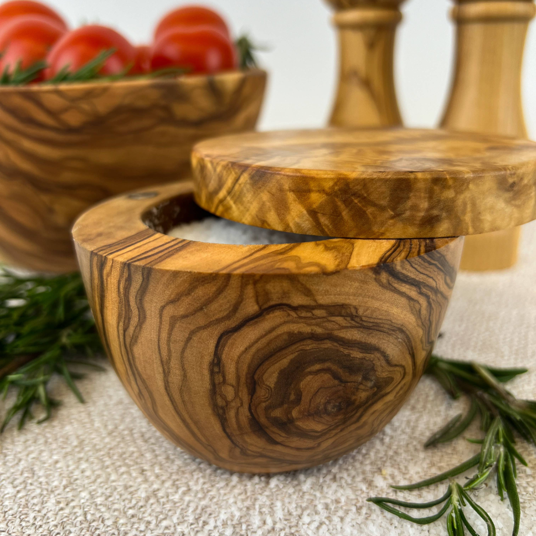 Experience the convenience and functionality of this Olive Wood Salt Cellar with its magnetic hinged top.