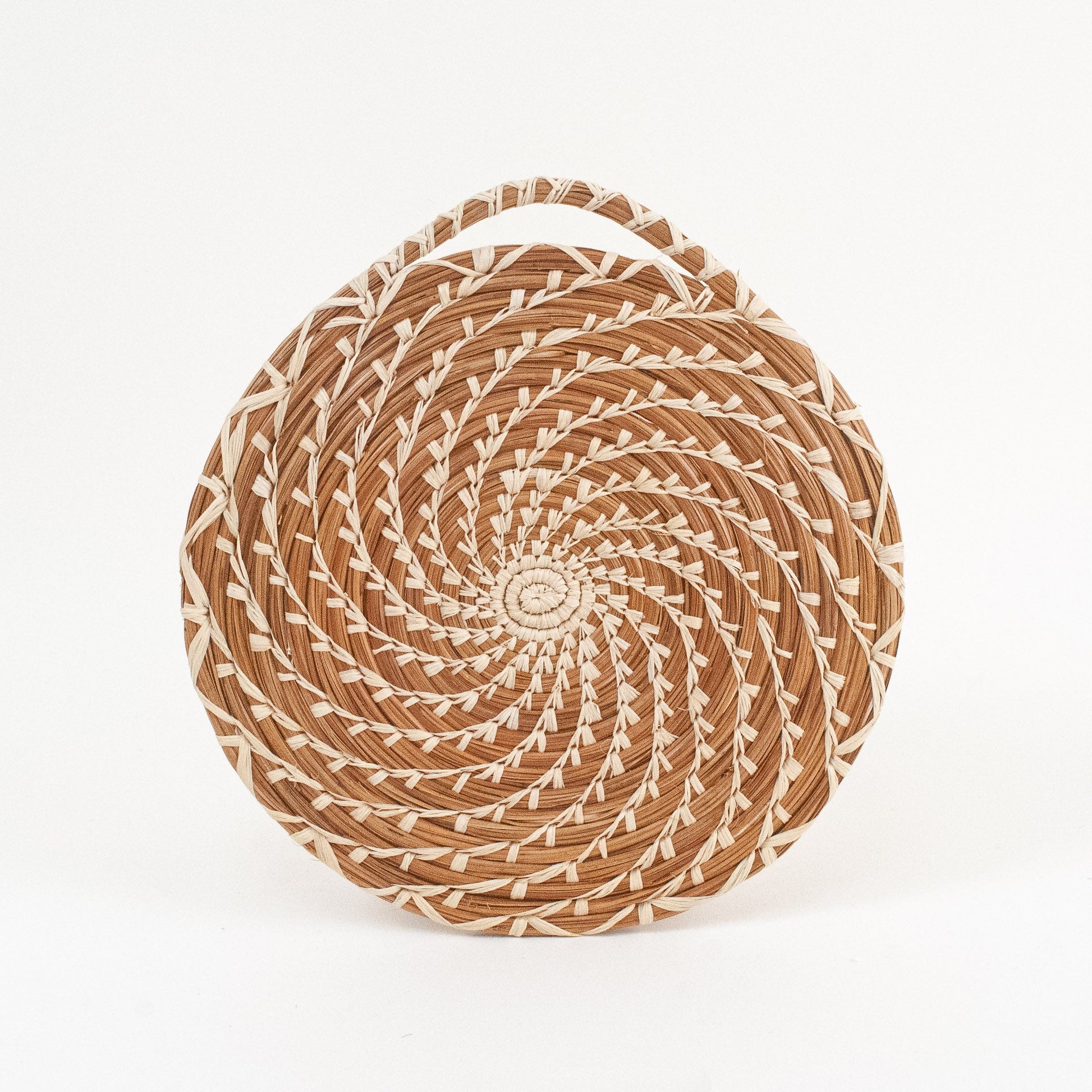 Intricately stitched using pine needles and raffia by artisans in Guatemala.