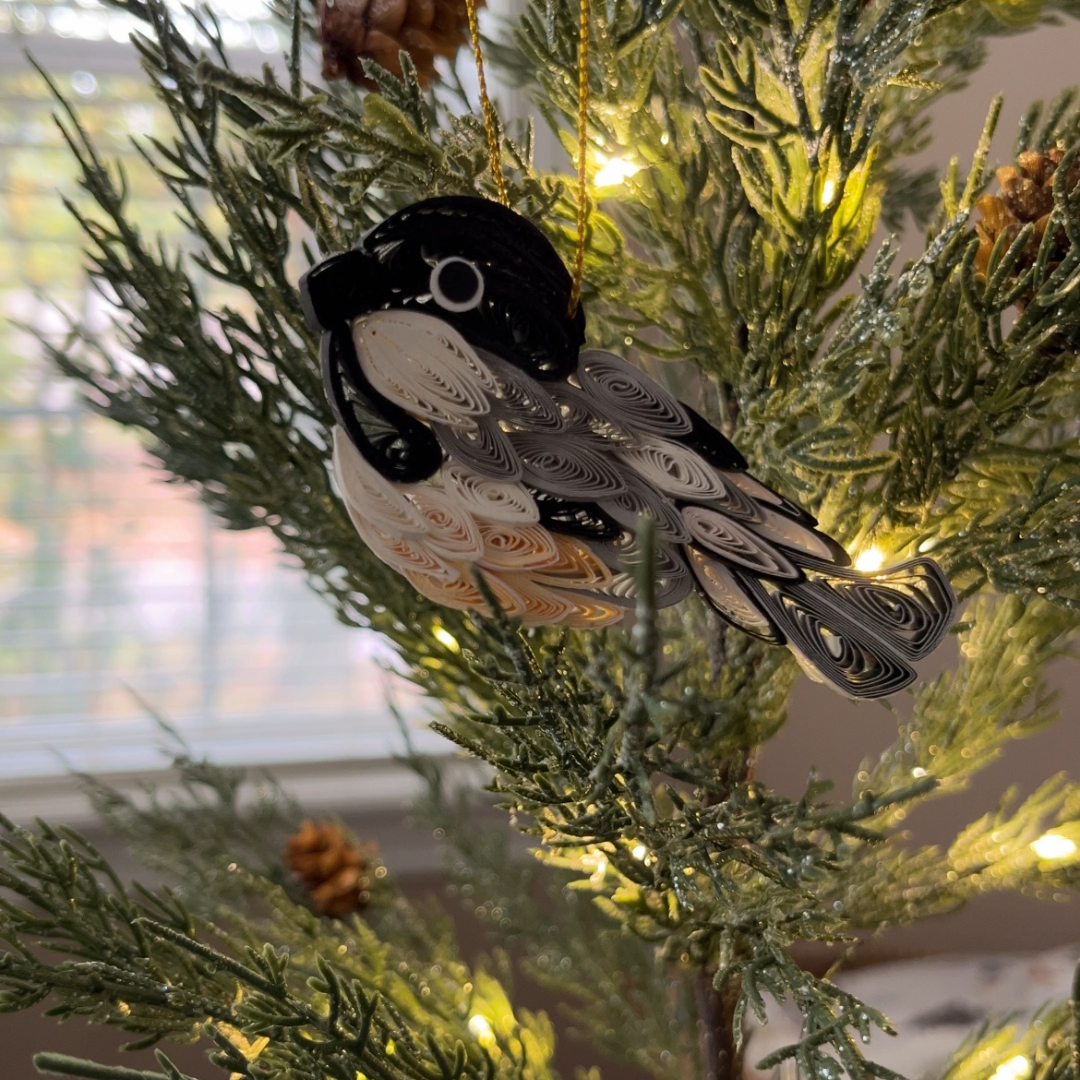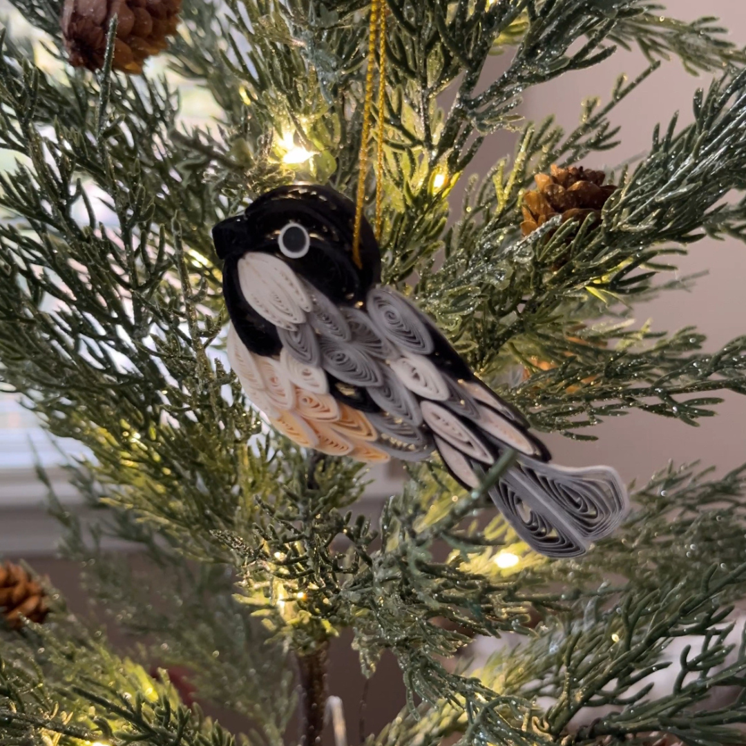 A Christmas chickadee for your Christmas tree - a unique ornament with creative 3D feathers made from quilled recycled paper.