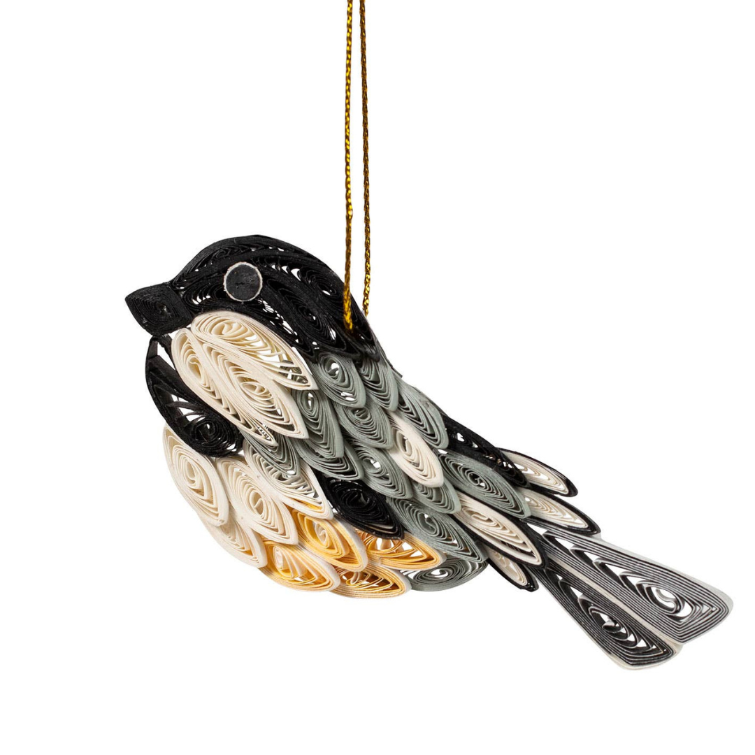 Chickadee: Quilled recycled paper - 3.5"L , gold thread.